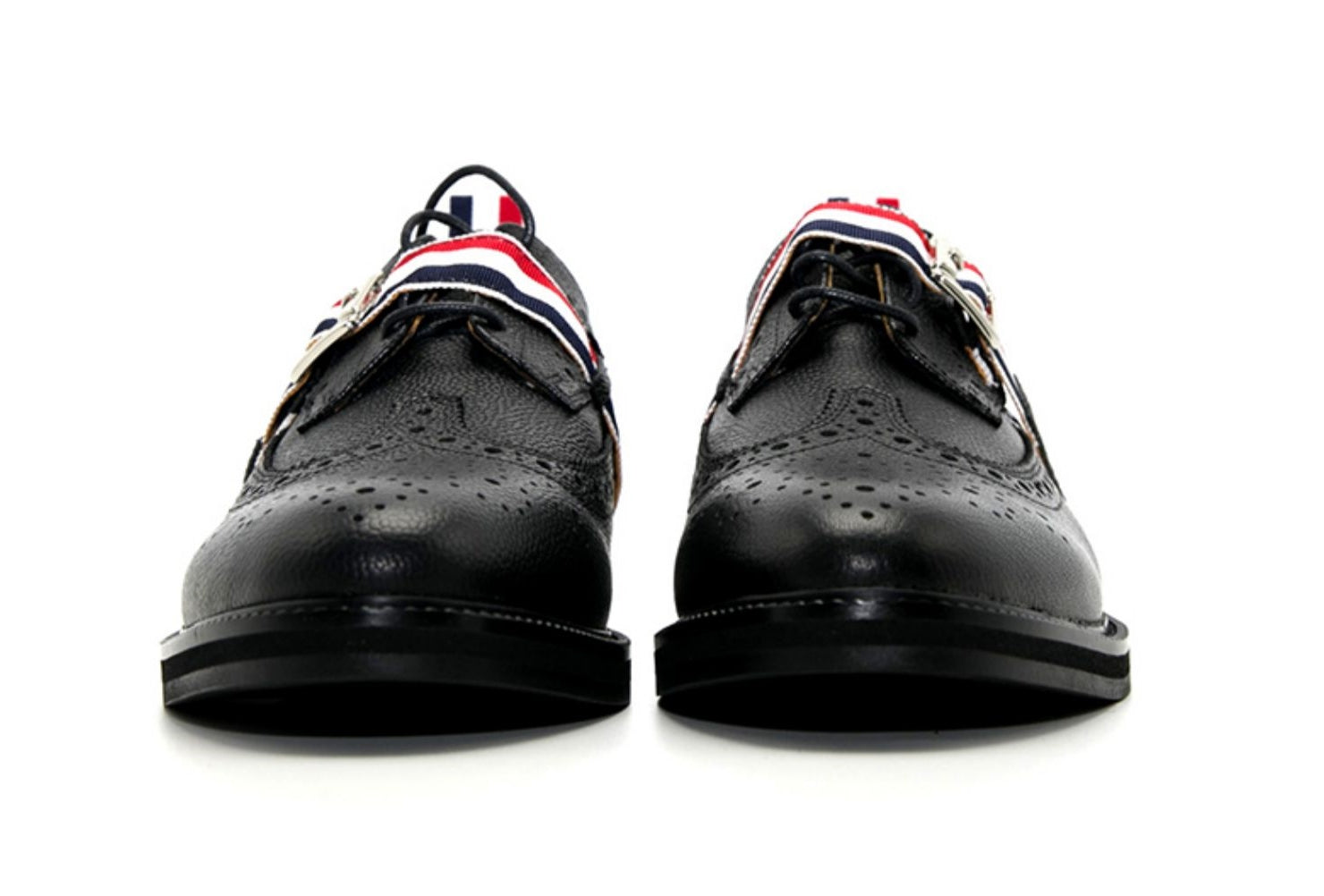 Signature striped grosgrain buckle at heel.
